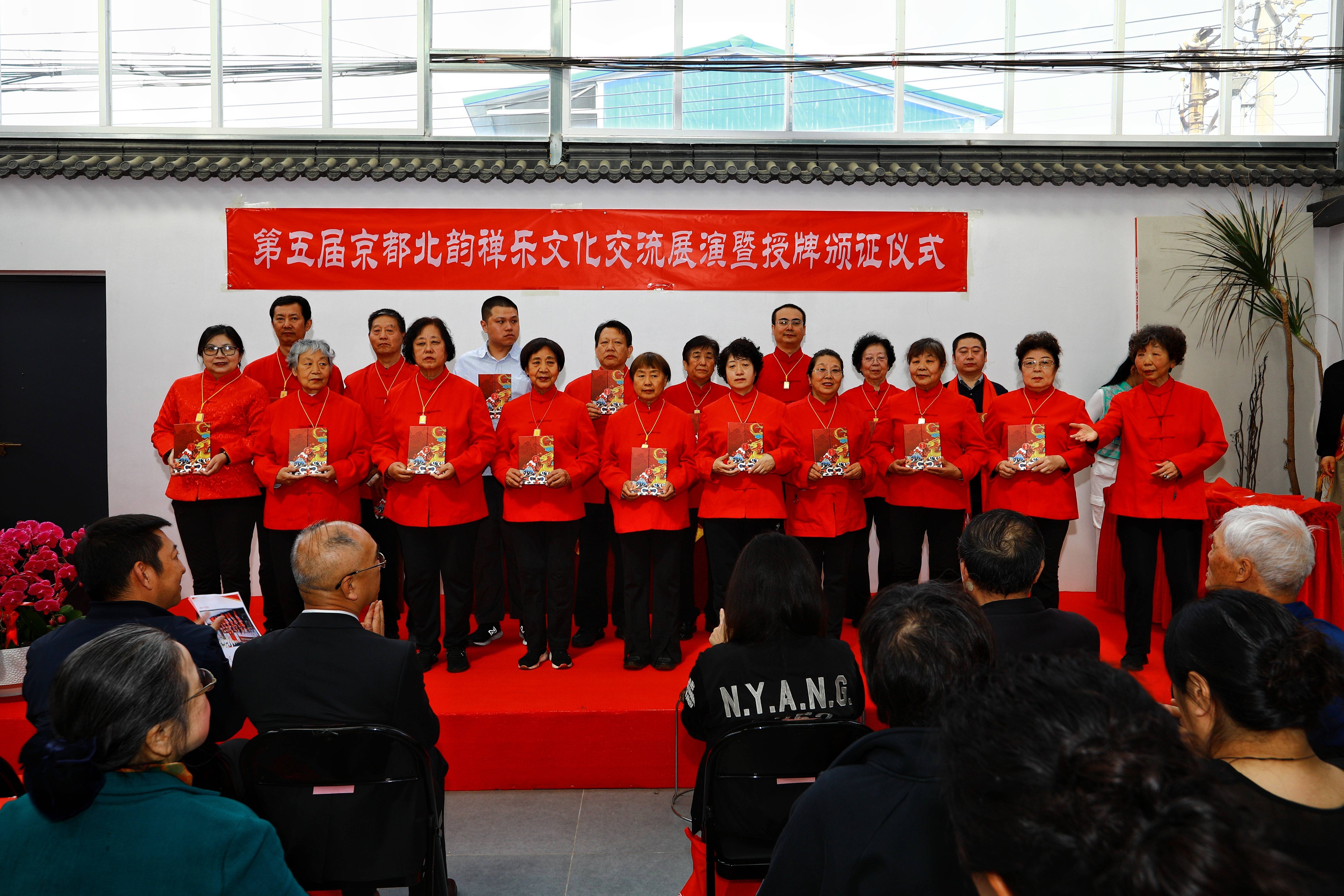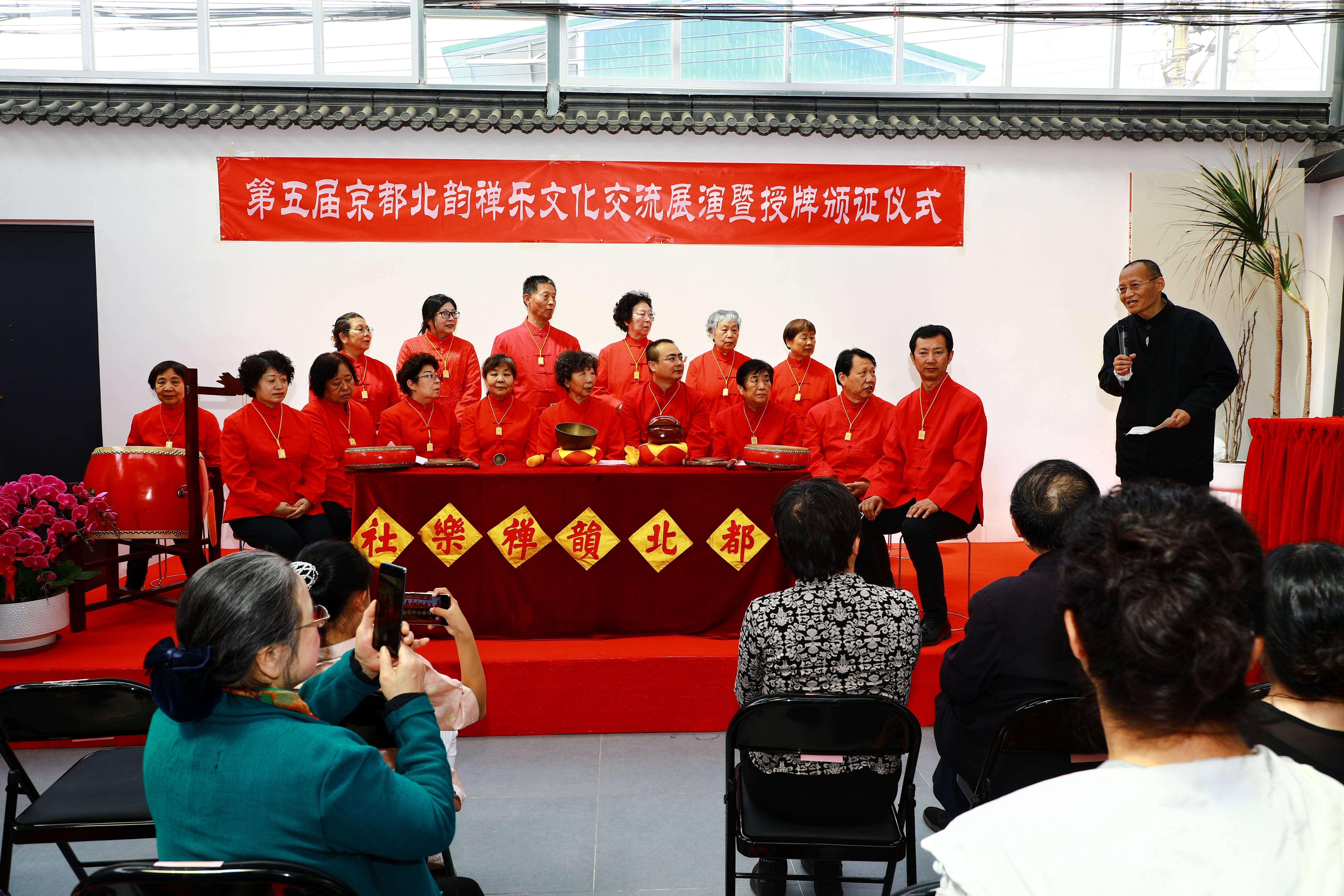 此次活动由刘征和杨淼分别担任男女主持人;京都北韵禅乐社的刘爱君社长发表了热情洋溢的欢迎词;其保护单位北京市佛教协会的步应华副会长兼秘书长向“潞畔人家”颁发了“京都北韵禅乐北京城市副中心传承基地”的铭牌;刘社长给北韵禅乐培训班的学员颁发了学员证书和辅导员证书,西城区文旅局非遗科赵岩科长见证了这一重要时刻,最后大家一起合影留念。