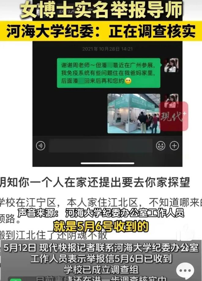5月12日,针对此事,现代快报记者联系河海大学纪委办公室,工作人员表示,举报信5月6日已收到,学校已成立调查组,目前事情还在进一步调查核实中。