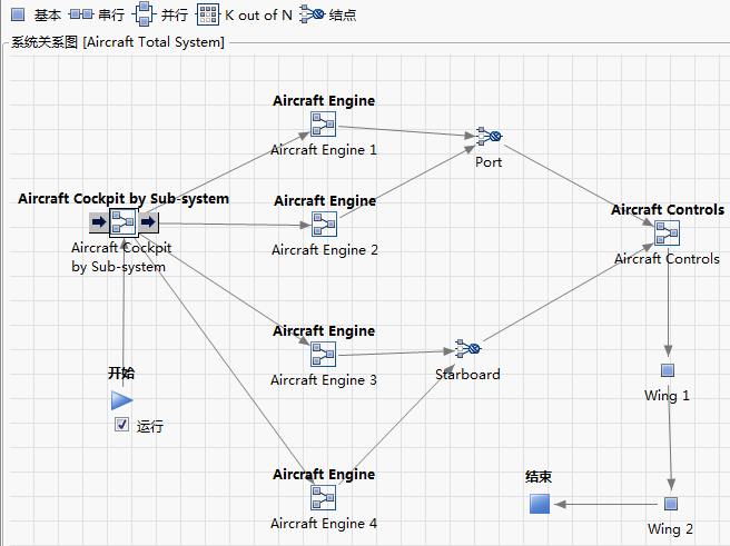 在JMP软件的“可靠性方框图”平台上,可靠性技术人员实施这个分析工作就会变得十分得心应手。只要点击鼠标,拖拉基本、串行、并行、结点和k out of n等不同的设计元素按钮,工程师就能在几分钟内构建出众多零部件之间的逻辑模型。如果系统包含子系统、二级子系统等多个层次,也可以通过调用库元素来实现多层次的嵌套设计。下图就是一个基于JMP软件绘制的飞行器系统的可靠性功能框图。