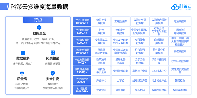 从市场和商业角度来看,目前AI大模型商业方式处于从通用类大模型过渡为垂直类大模型阶段,科创数据类,尤其是产业服务类垂直大模型处于一片蓝海时期,市场暂未发现推出重合度高的相关产品。《数据产业图谱(2024)》显示,2023年数据产业规模达2万亿元,预计2024 - 2030年均增长率继续保持20%以上,2030年数据产业规模将达到7.5万亿元,商业查询产业规模已经超过千亿元。科策云立足数据服务商,采用多平台、多模式商业模式,通过API数据接口、会员订阅、定制化软件、Saas、增值产品、商业智能BI等多种服务方案,满足不同客户的差异化数据需求,具有广阔的市场前景。